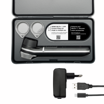 HEINE DELTA X dermatoskops , HEINE E4-USBC barošanas bloks , HEINE DELTA X CPP kontaktplāksne (3x), HEINE DELTA X dermatoskopa cietais futrālis